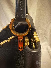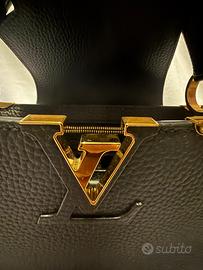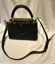 Louis Vuitton Capucines MM in pelle nera, impreziosita da raffinati inserti floreali laccati color oro sulla parte superiore, che donano un tocco distintivo e ricercato al modello iconico della Maison. Realizzata in pregiata pelle Taurillon, presenta il classico logo LV frontale e una struttura elegante ma funzionale. Dotata di manico rigido per portarla a mano e tracolla removibile per utilizzo a spalla. Interno spazioso e ben organizzato, ideale sia per il giorno che per occasioni più eleganti. Condizioni: eccellenti / pari al nuovo (specificare se presenti minimi segni)Colore: nero con dettagli oroMisura: MM (media) Borsa originale Louis Vuitton, sinonimo di eleganza senza tempo. Dimensioni: larghezza 32 cm, altezza 20 cm, profondità 11 cm Condizioni eccellenzi con piccola scoloritura sulla parte oro dei piedini d’appoggio