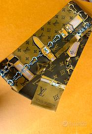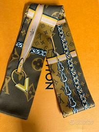 Il bandeau Monogram Confidential, perfetto come raffinata idea regalo, è realizzato in pregiata seta. L'elegante modello è decorato da una stampa di tracolle in pelle, catenelle e lucchetti, su uno sfondo impreziosito dall'iconico motivo della Maison.