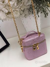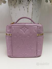 Micro vanity color wisteria.La pochette Micro Vanity è un accessorio delle dimensioni x compatte, ispirato alla tradizione per il viaggio della Maison l'esclusivo modello, in pelle Monogram Empreinte con finitura scintillante perlata, è dotato di una catenella regolabile e amovibile impreziosita da un charm con logo IV Circle. La minibag contiene un pratico specchietto ed è abbastanza capiente da accogliere tutti gli oggetti essenziali.