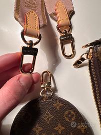 Vendo iconica Multi Pochette Accessoires in tela Monogram con dettagli in vacchetta naturale e tracolla jacquard rosa. Un pezzo versatile che può essere scomposto e indossato in diversi modi (crossbody, a spalla con catena o come pochette singole).