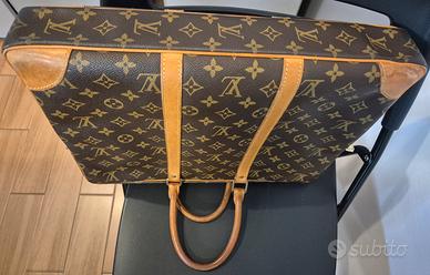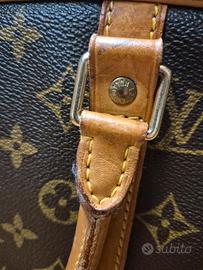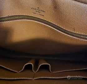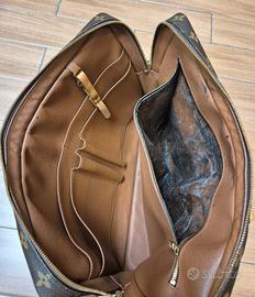 Si tratta di una borsa/portadocumenti Louis Vuitton Monogram, comunemente nota come Sac Plat o una variante simile come la Serviette Conseiller o la President. Questo modello è caratterizzato dal classico motivo Monogram di Louis Vuitton, con finiture in pelle vacchetta e hardware dorato. Esternamente presenta leggeri segni di usura solo agli angoli della base, internamente sono presenti segni di usura leggeri nella parte alta sia a destra che a sinistra. All'interno della tasca cernierata è presente un forte segno di usura causato dalla reazione di una monetina di rame.