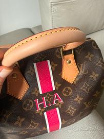 Originale Louis Vuitton Speedy 25 originale, personalizzata Mon Monogram con iniziali “H.A” e banda centrale fucsia/bianco.