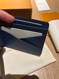 Portafoglio Louis Vuitton Multiple Wallet – Taigarama Louis Vuitton Multiple Wallet in canvas Monogram Pacific e pelle Taïga, parte della collezione Primavera-Estate 2019. Dimensioni: 11,5 x 9 x 1,5 cm (lunghezza x altezza x profondità) Materiali: pelle di vitello Taïga e canvas Monogram Pacific rivestito Colore: Blu Navy Finiture: dettagli in metallo color argento Interno: fodera in tessuto Funzionalità: 3 slot per carte di credito 2 scomparti per banconote e ticket 2 tasche laterali per ricevute 2 slot per biglietti da visita