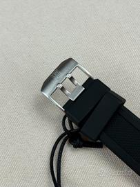 Movimento al quarzo (515 Ronda, Swiss Made). Dotato di lancette e indici luminosi, lunetta unidirezionale e datario a ore 3. Diametro cassa 44 mm.