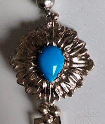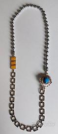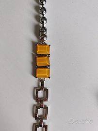 Lunga collana in acciaio e pietre, dal gusto bohémien, : per avere in noi sempre indosso, un'invincibile estate. Lunghezza: cm 44. Impreziosita nei laterali da un cabochon, con centrale in pietra turchese, logato IRA DEL VALLE e, da un susseguirsi di rettangoli piatti color del sole.