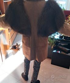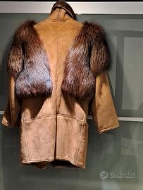Bellissimo e particolare giaccone in montone marrone con spalle in volpe . Marca Mabrun made in italy