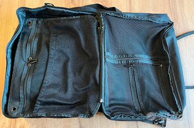 Esterno robusto e durevole che include ulteriori scomparti con cerniera, maniglie e una robusta cinghia regolabile con clip. Presenta tocchi di vernice nera lucida.