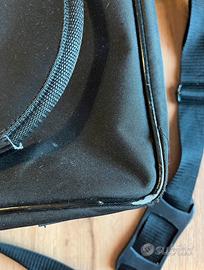 Presenta piccoli segni di usura (vedi foto) che non ne compromettono l'utilizzo. All'esterno funziona solo una zip per chiuderla.