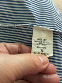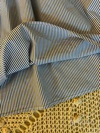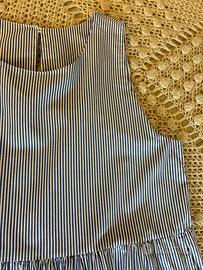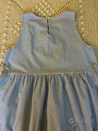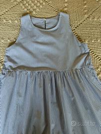 Abito in puro cotone originale Made in Italy Tg U. Sottilissime righe verticali bianche e blu. Modello smanicato,scollo tondo con goccia posteriore chiusa da un bottoncino,2 tasche laterali e 2 balze morbide. Lunghezza cm 118. In perfetto stato