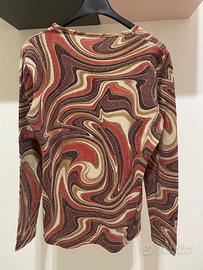 Maglia a maniche lunghe da donna caratterizzato da una fantasia astratta nei toni del bordeaux, marrone e oro con inserti metallizzati