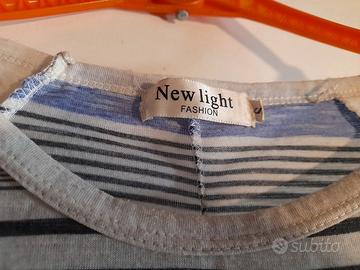 Maglia in tessuto leggero, caldo,semi-trasparente, a righe bianche e azzurre, con taschino in pizzo macramè e maniche a 3/4. Taglia: S, vestibilità abbondante.
