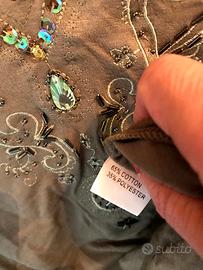 Maglia lunga o tunica in morbida e leggera maglina elasticizzata Cotone 65% Poliestere 35%. Con ricami e pietre, balza asimmetrica.
