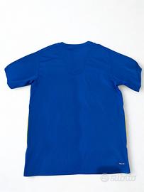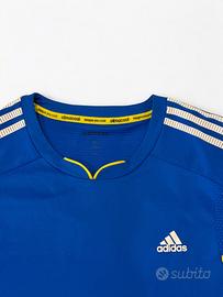 Maglia sportiva adidas da uomo, colore blu acceso con dettagli gialli e strisce bianche sulle spalle.
