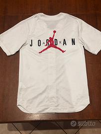 Maglia Jordan originale bianca, in tessuto mesh traspirante, con logo Jumpman rosso e scritta “JORDAN” nera sul petto. Design sportivo, maniche corte, perfetta per streetwear o outfit estivi.