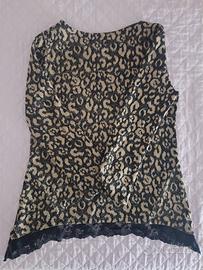 maglia maniche lunghe fantasia leopardata nei toni del nero e beige. Tessuto morbido tipo maglina/caldo cotone. Dettaglio: Fondo asimmetrico a punta più lungo dietro, con inserto in pizzo nero che si intravede. Scollo a barchetta Vestibilità: Morbida, non attillata. Copre i fianchi davanti e scende dietro. Perfetta con leggings o jeans skinny Stagione: Autunno/inverno, mezza stagione Marca: New Collection Condizioni: buone, Nessun difetto, pizzo integro Capo particolare che dà carattere anche a un outfit basic.