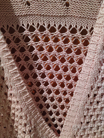 Maglia aperta rosa chiaro a maniche lunghe, lunghezza vita, lavorazione ad uncinetto in cotone. Marca I Gabbiani, made in Italy, non c'è un'etichetta che indichi la taglia, ma veste perfettamente una S. In perfette condizioni perché indossata solo una volta.