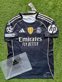 Maglia Real Madrid Away 2025/26, Adidas, MBAPPÉ 10, taglia M. Design elegante in blu/grigio scuro con dettagli giallo fluo, motivo a linee orizzontali su tutta la maglia.