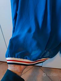 Blusa a maniche lunghe blu, leggermente trasparente, con scollo a V . Polsini e fondo con elastico a righe rosse, bianche e blu. Taglia S/M.