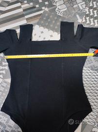 Maglia nera a body, elasticizzata ,mezza manica particolare con spalla scoperta e spallino.