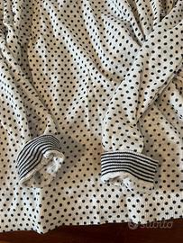 Maglia Burberry Brit , 100% lino, colore bianco a pois blu, taglia M (vedi misure). Modello girocollo che scende dritto, sulla schiena ha un gioco di cuciture che lo rendono morbido e blusante. Etichetta con brand in metallo blu. Misure: spalle 42 cm, lunghezza 58 cm. Molto fresco e leggero.