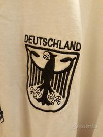 Maglia retro della Germania, modello olimpiadi, in cotone, etichetta taglia rimossa, ma dovrebbe essere una XL (ascella 63 cm circa; altezza 71,5 cm circa). Lo stemma nazionale con la scritta è ricamato in tessuto in rilievo e termosaldato. Il colletto ed i polsini sono in cotone nero cuciti sul tessuto. Il colletto è chiuso con laccio nero passante tra le asole. Articolo usato poco è in ottime condizioni generali e ben conservato.