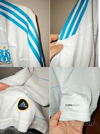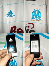 Maglia dell'Olimpique Marsiglia stagione 2010-2011, marca Adidas made in China tg XXL. I loghi e lo stemma del club e sponsor tecnico davanti sono ricamati in tessuto in rilievo e termosaldati, mentre lo sponsor commerciale è termo applicato in plastica sottile in rilievo. Le bande laterali Adidas azzurre lungo le spalle e maniche sono cucite sul tessuto. In basso davanti a dx è termo saldato logo in plastica in rilievo dello sponsor tecnico, mentre a sx è termo applicata la scritta Climacool. Articolo nuovo con cartellino, originale da store del periodo.