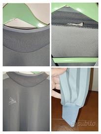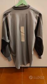 Maglia portiere vintage, periodo 2001-2002,col n. 1, modello Kahn, marca Adidas, etichetta taglia rimossa ma dovrebbe essere una XL (ascella 62 cm circa; lunghezza maniche da polsino ad attaccatura colletto 75 cm circa; altezza davanti 74 cm circa; dietro 79 cm circa). Presenta imbottiture dì protezione ai gomiti senza difetti. Il logo e la scritta Adidas davanti sono ricamati in filo grigio in rilievo, mentre il numero 1 è floccato in vellutino bianco e termo saldato. Sulla zona sx in basso è cucita esternamente targhetta in tessuto con scritta Clima Lite, mentre a dx è cucita targhetta in tessuto con logo Adidas e scritta Kahn. Articolo originale dell'epoca, poco usato, è in buone condizioni generali e ben conservato.