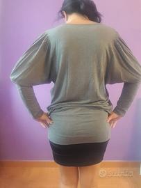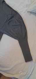 Bellissima maglia Calliope color grigio melange, caratterizzata da un particolare design oversize con drappeggio frontale e maniche a pipistrello. Il fondo è aderente a fascia, perfetto per valorizzare il punto vita.