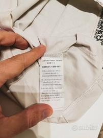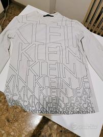 Vendo maglia uomo maniche lunghe Calvin Klein Jeans, bianca con scritte fantasia nere, come da foto, elasticizzata, cotone (95%) ed elastene (5%), sportiva ma elegante, indossata una volta sola (mi è grande, vesto una M).