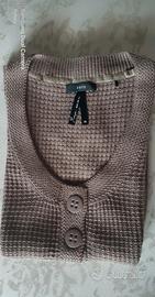Originale cardigan a manichine corte, con scollo profondo, a 3 bottoni e una leggera arricciatura sui due lati al punto vita.