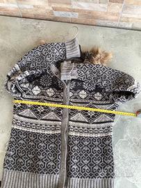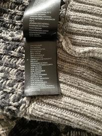 Maglia/cardigan H&M con cappuccio e bottoni a pressione. Fantasia montana in cotone, viscosa e angora come si vede nell etichetta in foto. Le maniche non sono molto ampie e sono abbastanza lunghe. Non ha alcuna lacerazione.