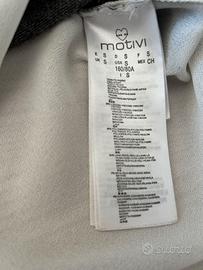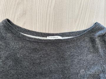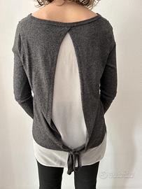 - Modello: maglia grigia ampia con collo a barchetta, logo in basso e fiocco sul retro. Camicia bianca incorporata