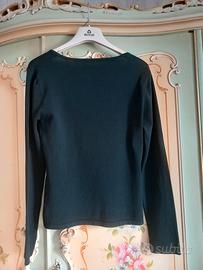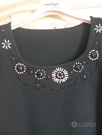 maglia nera aderente maniche lunghe con serie di margherite di perline bianco e nero sulla scollatura