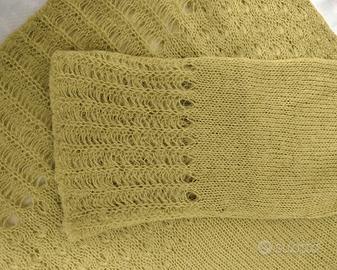 Maglia donna, verde, scollo a v, maniche lunghe leggermente a campana, lavorazione in parte traforata. Ideale per le temperature fredde. Taglia S veste piccolo.