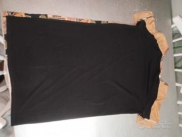 Bellissimo abito a tunica firmato Conbipel con maniche corte e risvolto color cammello. Il davanti è caratterizzato da una fantasia geometrica sui toni del beige e dell'ocra, mentre il retro è totalmente nero a contrasto. La vestibilità è dritta e scivolata, ideale per un look boho-chic o casual.