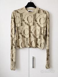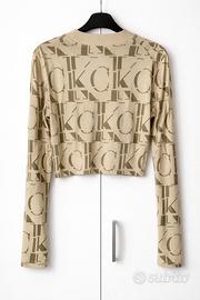 Maglia crop Calvin Klein a maniche lunghe Maglia crop a maniche lunghe firmata Calvin Klein, in tonalità beige/khaki con stampa all-over del logo “CK”. Modello aderente con girocollo e tessuto elasticizzato, comodo e valorizzante. Perfetta per outfit casual o streetwear, da abbinare a jeans a vita alta o pantaloni cargo. Dettagli: -Colore: beige con stampa logo marrone -Vestibilità: aderente / crop -Maniche lunghe -Girocollo -Tessuto morbido ed elasticizzato