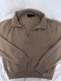 Maglia in colore marrone chiaro/ sabbia, materiale 100% lana, con colletto stile polo, orlo e polsini a coste. Vestibilità: regolare