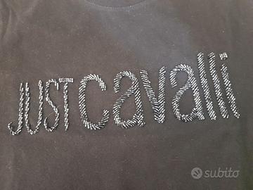 Manica lunga, scollo rotondo, colore nero, impreziosita da ricamo scritta Just Cavalli a livello del petto, tono su tono,in rilievo, con lavorazione a cannette piccole (vedi foto).