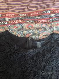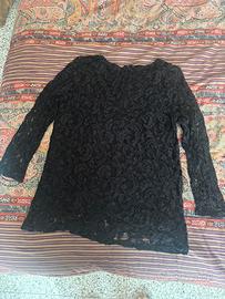 Maglia a maniche lunghe in pizzo nero con l’interno in tessuto e cerniera dietro nel collo. C’è scritto taglia M ma è da considerare come S.