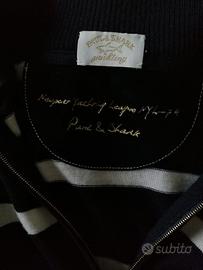 Maglia in pura lana, mezza zip frontale, a righe blu e bianche sul fronte e sul retro. Maniche tinta unita. Grande logo sul fronte sinistro in brillantini. Ottime condizioni, indossata pochissimo. Una maglia senza tempo, sempre di moda. Misure: spalle 41 cm- sotto ascella 52- lunghezza 63. Taglia L