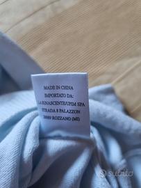 maglia donna di vistosa, manica lunga, collo a V davanti e dietro con ricami davanti e nella manica. Colore celeste chiaro, ricami verde e marrone con pagliette e perline. Rinascente/Upim usata