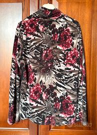 Maglia Cheitt presenta una vibrante stampa a fiori grandi su sfondo astratto grigio e nero, arricchita da punti luce sul collo. Il design morbido con scollo a scialle e drappeggio frontale valorizza la figura con femminilità. Realizzata in tessuto confortevole. La taglia non è precisata, ma dovrebbe essere una 48.