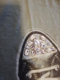 Colore verde militare con stampa e con applicazione di strass sulla punta della converse.