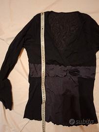 Maglia da donna nera con scollo a V incrociato e maniche lunghe.
