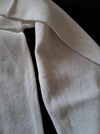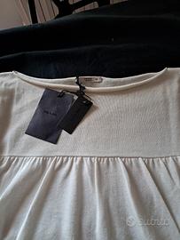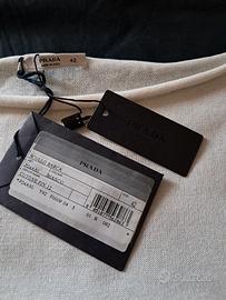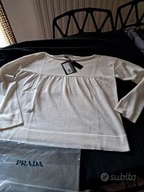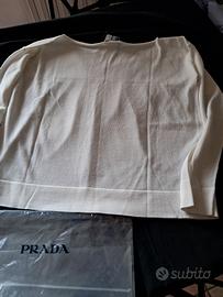 maglia donna bianco in cotone filo di Scozia pregiato. originale Prada. collo a barca arrotolato. modello dritto, mai indossato ancora con cartellino. piccola macchiolina nella manica sx sotto, indossata non si nota. misure collo larghezza cm 30. lunghezza maglia cm 54 larghezza spalle cm 44.
