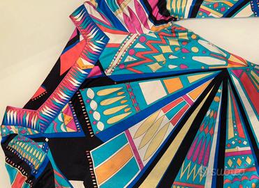 Questa maglia firmata Emilio Pucci (taglia M) è un classico esempio dello stile iconico della maison, caratterizzato da un'estetica geometrica e vibrante. Ecco una descrizione dettagliata dei suoi elementi principali: đ¨ Design e Stampa ⢠Motivo Geometrico: La stampa è un caleidoscopio di forme dinamiche (triangoli, semicerchi e raggi) che creano un effetto ottico di movimento, tipico dei pattern d'archivio di Pucci. ⢠Palette Cromatica: Un mix audace e sofisticato che vede protagonista il nero come base di contrasto, accostato a tonalitĂ di azzurro turchese, rosa acceso, arancio corallo, giallo ocra e bianco. ⢠Dettaglio Logo: Come richiesto, la stampa integra le piccole scritte "Emilio" (la firma autografa dello stilista) mimetizzate tra i decori grafici, un segno distintivo di autenticitĂ del marchio. âď¸ Taglio e Vestibilità ⢠Scollo: Presenta uno scollo a barchetta (o leggermente squadrato) rifinito con una bordatura decorativa che incornicia il dĂŠcolletĂŠ, riprendendo i motivi geometrici del resto del capo. ⢠Maniche: La maglia ha maniche a tre quarti che si allargano leggermente verso il fondo (stile "a campana" o svasato), conferendo un tocco elegante e vintage anni '60/'70. ⢠Silhouette: La taglia portabile per taglie S/M/⢠offre una vestibilitĂ regular/slim, pensata per scivolare sul corpo senza stringere eccessivamente, valorizzando le forme grazie alla qualitĂ del tessuto (solitamente jersey di seta o cotone elasticizzato, tipici del brand). ⨠Dettagli di Stile Il bordo inferiore e i polsini sono rifiniti con una fascia ornamentale che richiama il motivo dello scollo, creando un equilibrio visivo perfetto. Ă un capo versatile, ideale sia per un look da giorno ricercato che per un evento serale informale ma chic.