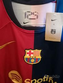 Maglia Nike del giovanissimo fenomeno del Barcellona Lamine Yamal, protagonista assoluto con la vittoria della Liga, della Coppa del Re e della Supercoppa Spagnola, annientando il Real Madrid in tutte le competizioni, oltre che del raggiungimento delle semifinali di Champions League e dell'Europeo recentemente vinto con la nazionale spagnola.