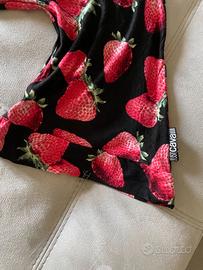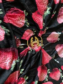 T-shirt con fantasia fragole. Marca originale JUST CAVALLI. Taglia 46 elasticizzata. Mezza manica larga. Logo JC con brillantini in centro petto.