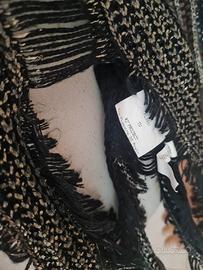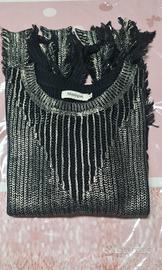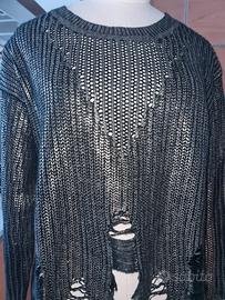 Maglia stile gotico grungle effetto consumato, taglia unica. Glamour, casual-chic per outfit di tendenza e alla moda. Il tessuto è comodo, morbido e fine e la tessitura in contrasto di colore ne risalta il senso della moda. È di colore nero con una finitura lucida/metallica argentata/oro con lavorazione a maglia a punto aperto. Traforata sulle maniche e sul décolleté che gli dona quel tocco di fascino e originalità. Brand Monique, taglia Unica che va, bene da una, S ad una L tranquillamente. Versatile si abbina ad ogni stile dall'abbigliamento quotidiano a quello più impegnativo.