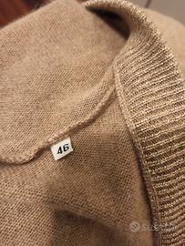 Maxi cardigan beige con profili in lurex e ricamo 3 medaglie, anni 90 ma conservato benissimo. Lana e angora. Tg .46 donna